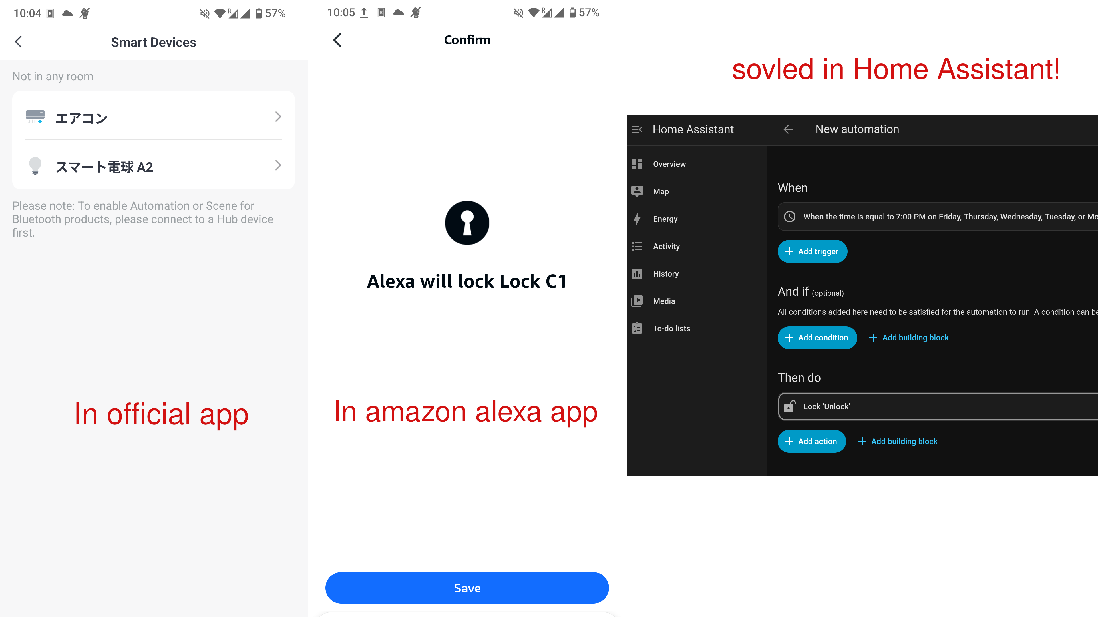 But! When I installed it, I found that it cannot be setted a schedule in official app. so I try to use Alexa to set a schedule, BUT Alexa can only set for lock, there don’t have any option to set for unlock. finally I have to install Home Assistant(Open source home automation) in my server to solve this problem.